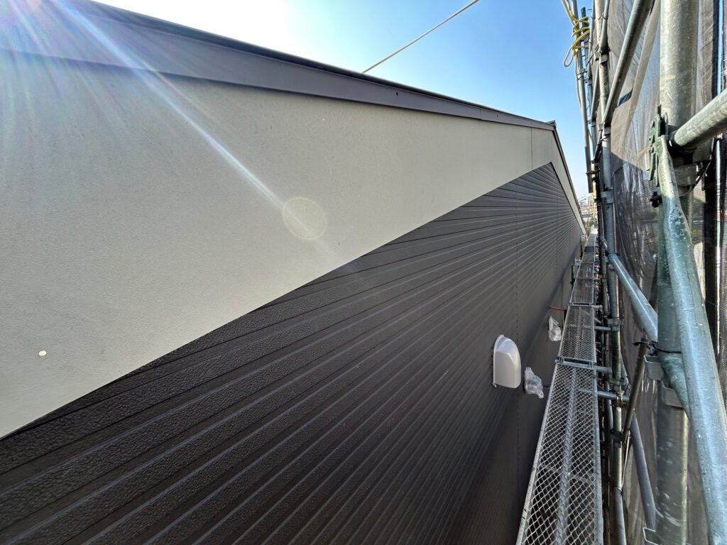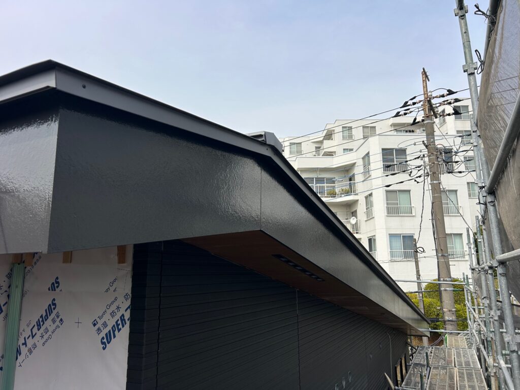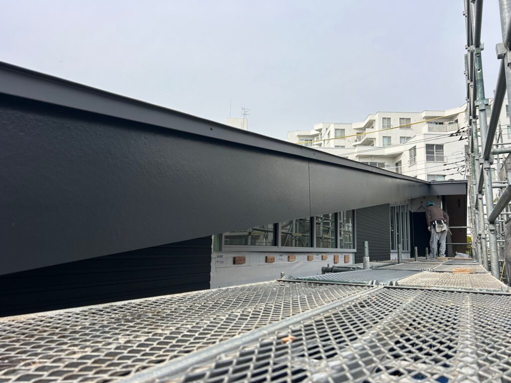 川崎市で新設幼稚園塗装工事の様子になります。 新規破風板の塗装を行いました。工程が非常にタイトな現場で予定を変更しての着手でしたが無事に終わらす事が出来ました。 足場解体後に通路手摺や亜鉛メッキ外階段の塗装を予定しています。