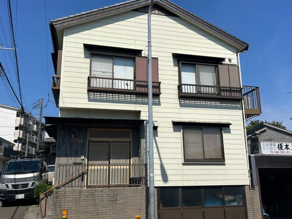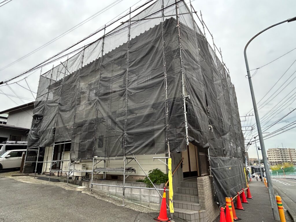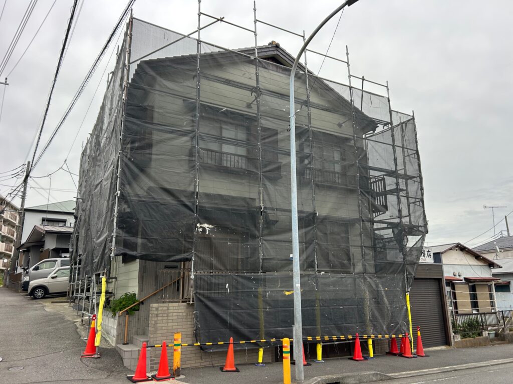 歩道との境界がほとんどない為、占用許可を取り歩道上に足場を設置しました。