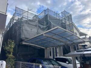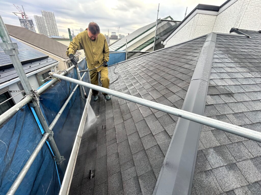 仮設足場工事が完了したので、本日外壁と屋根の高圧洗浄を行いました。